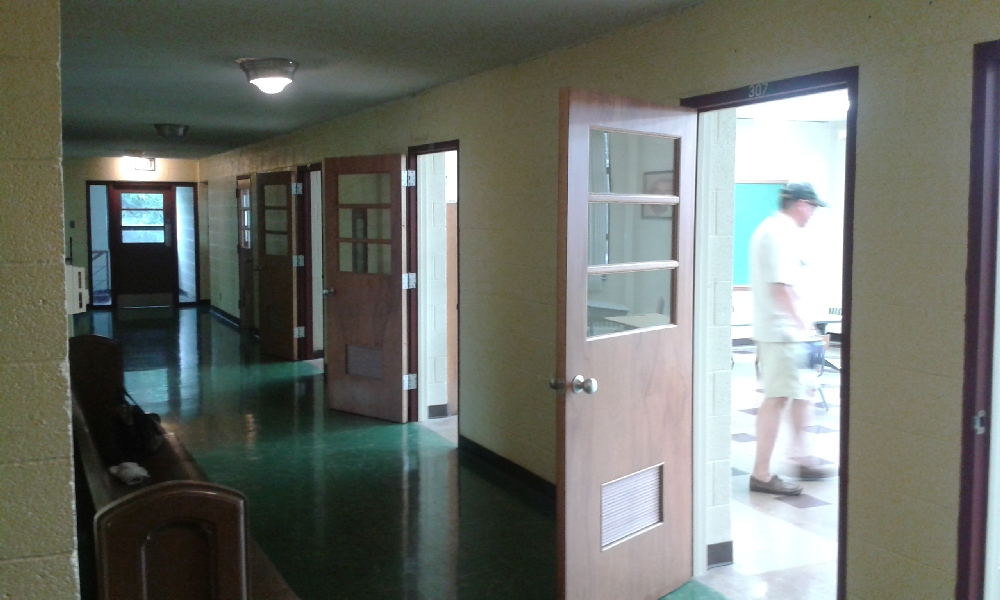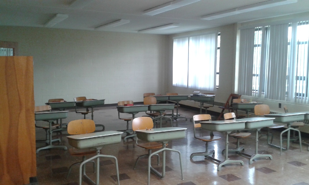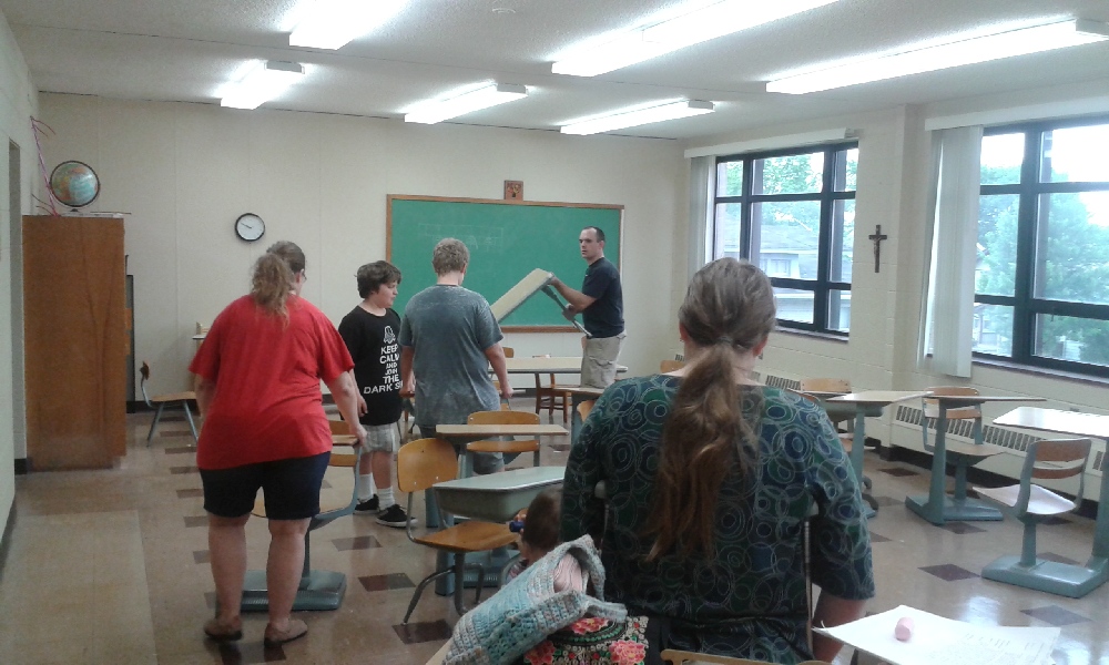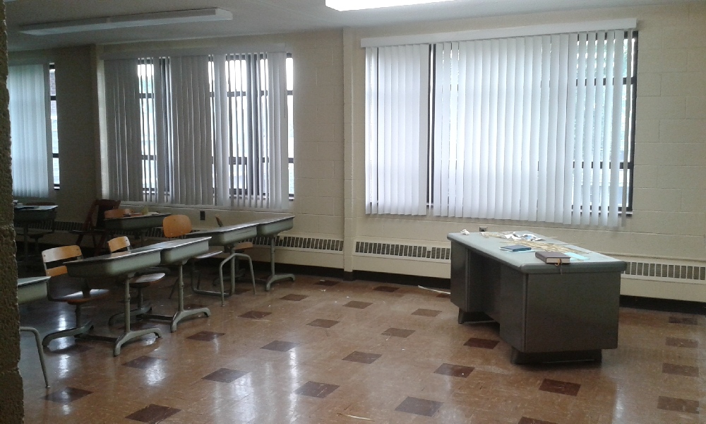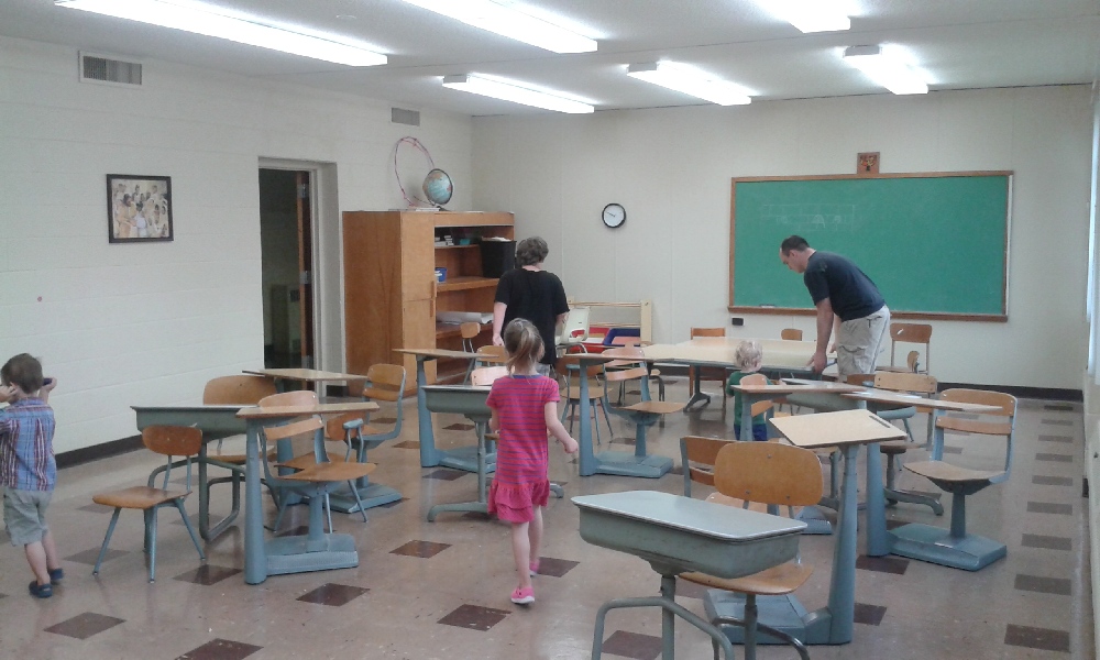 More old school desks we cleared to make room for cleaning, decorating, and new furniture. Notice the all-new ceiling lights and the fresh paint job in the classrooms, arranged by the hardworking Redeemer parishoner Effie Sheron. Also the lovely big windows that bring in tons of daylight.