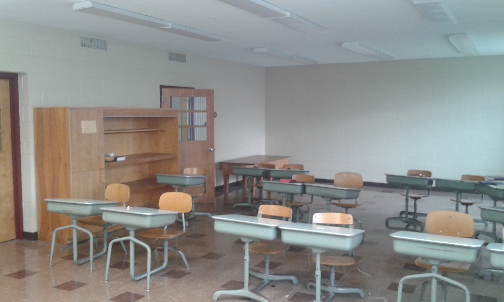 Notice the giant metal 1960s teacher desk. Yeah, we got rid of that. And it sure was heavy! You could hide from the Russians under that one quite comfortably.