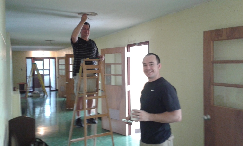 Fort Wayne City Council member and school volunteer Jason Arp valiantly wrassles up new lights in our hallway, with help from school Headmaster Nathaniel Pullmann. They ended up providing vibrant and cheerful lighting.