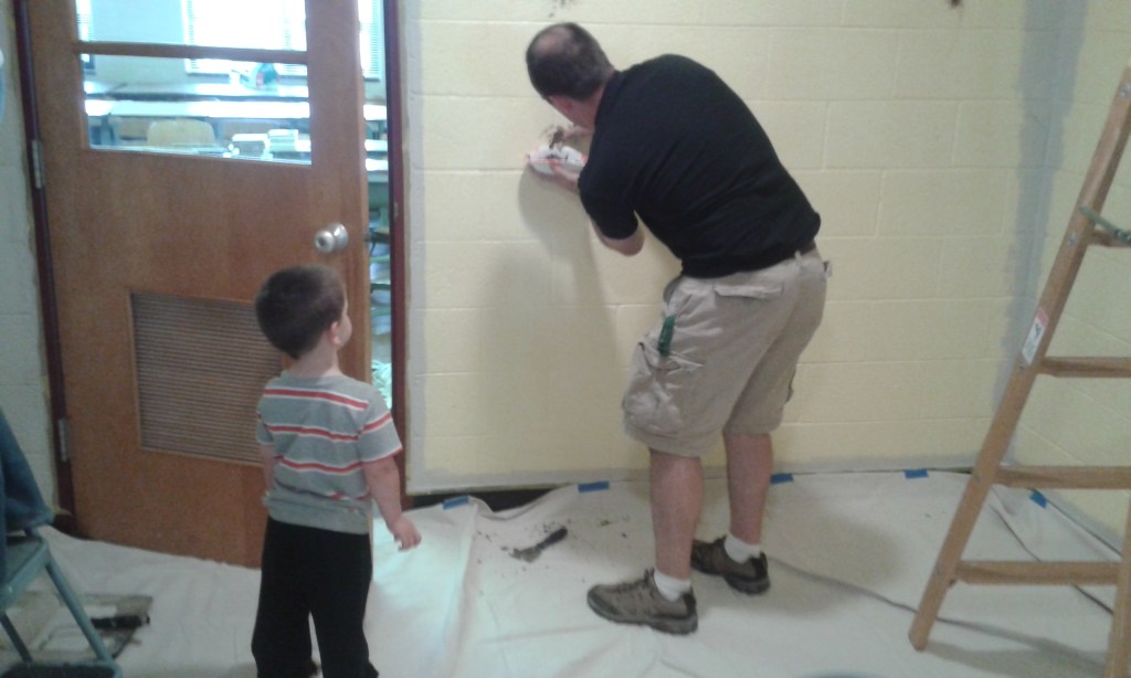 Here’s how we did it. First, here’s Nathaniel Pullmann filling in a few wall holes pre-painting. Oh, that yellow paint is just too ugly!