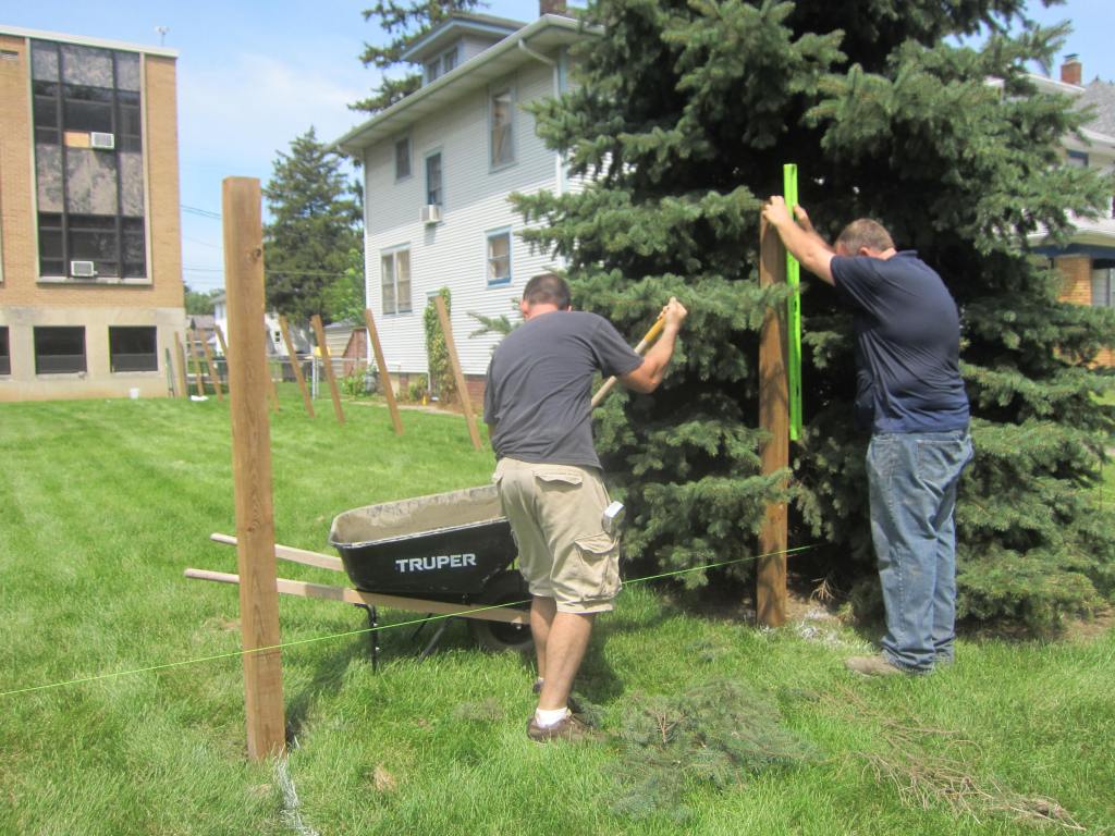 Phew, that’s a lot of work! But that’s not all. Oh, no, that’s not all. Another set of men have been busy putting up a fence around our playground area. Here are Nathaniel and Randy setting fence posts. In another life Nathaniel was a professional fence-builder, so he knows the trade.