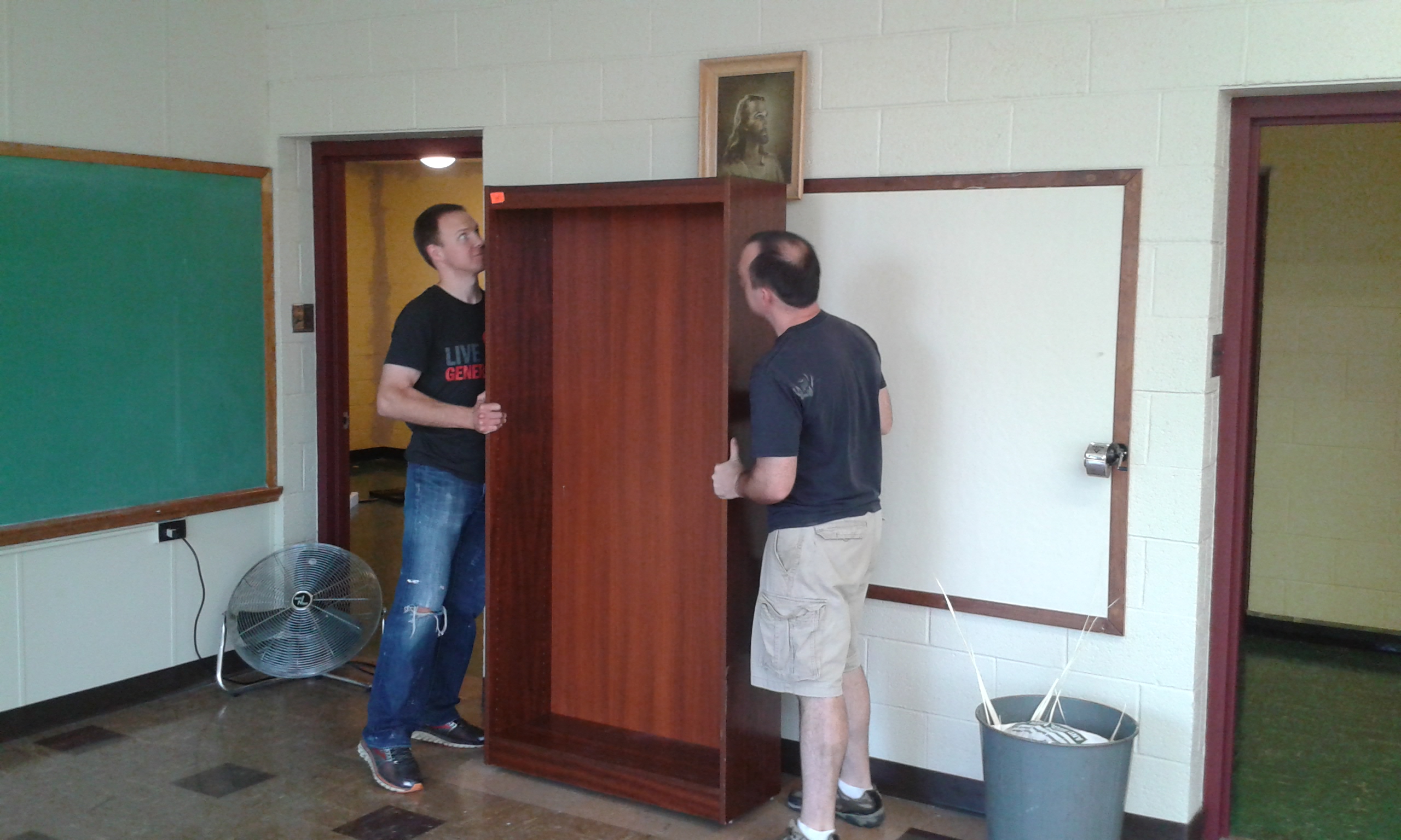 Here are Nathaniel and board member Daniel Burfiend moving furniture. A donor gave us these beautiful cherry bookshelves free, along with a set of eight matched bookshelves for the library, giant frames for reproductions of famous documents and paintings, and a display case.