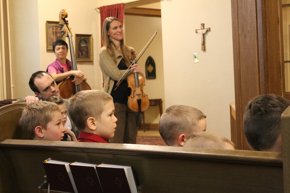 This Friday Redeemer Classical students, their families, and friends enjoyed a music demonstration by the Bach Collegium. Ensemble members introduced and demonstrated their instruments, answered questions, then performed a selection of Bach pieces. Several of these instruments were period Baroque instruments children wouldn’t encounter at a typical orchestra or other classical concert. The kids (and parents!) enjoyed their visit immensely.