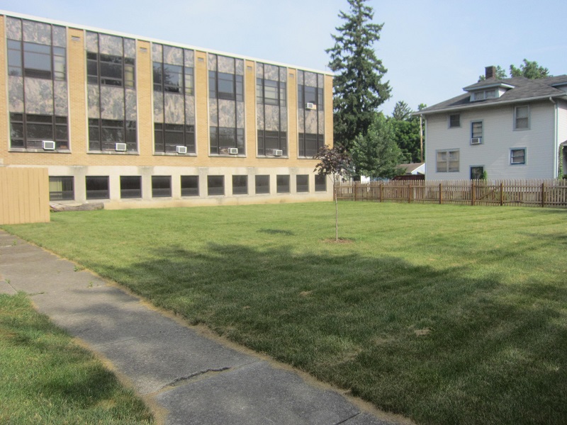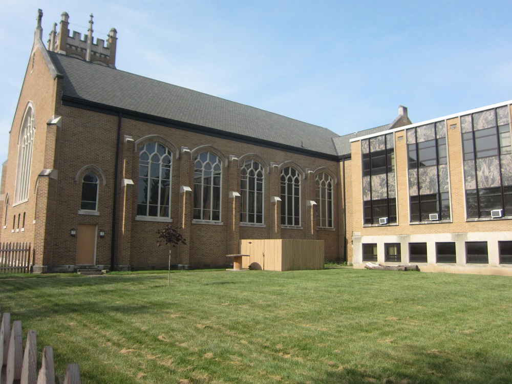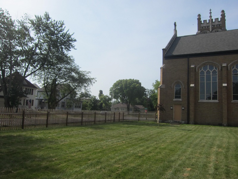 Here is the view from the far corner of the play yard, facing where the church and school building meet.