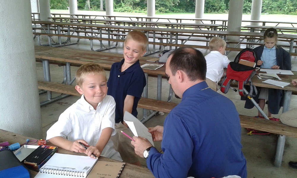 This year’s nature walks began Friday with a full house at Foster Park. Thanks to the light drizzle, we moseyed on into the large pillared “temple” to begin a year-long project: A bird log. At the end of the year, parents will judge the logs on quality, number of entries, neatness of writing, and so forth and award first, second, and third prizes for best bird log.