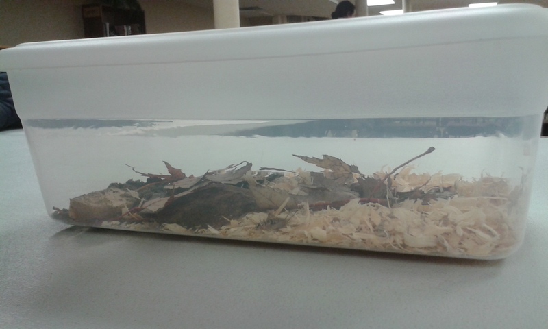 The crickets got pieces of potato to eat. See if you can find the cricket in this picture. There are a variety of potential bedding materials inside the home — students were tasked with hypothesizing then observing over days which bedding they thought their cricket would like best.