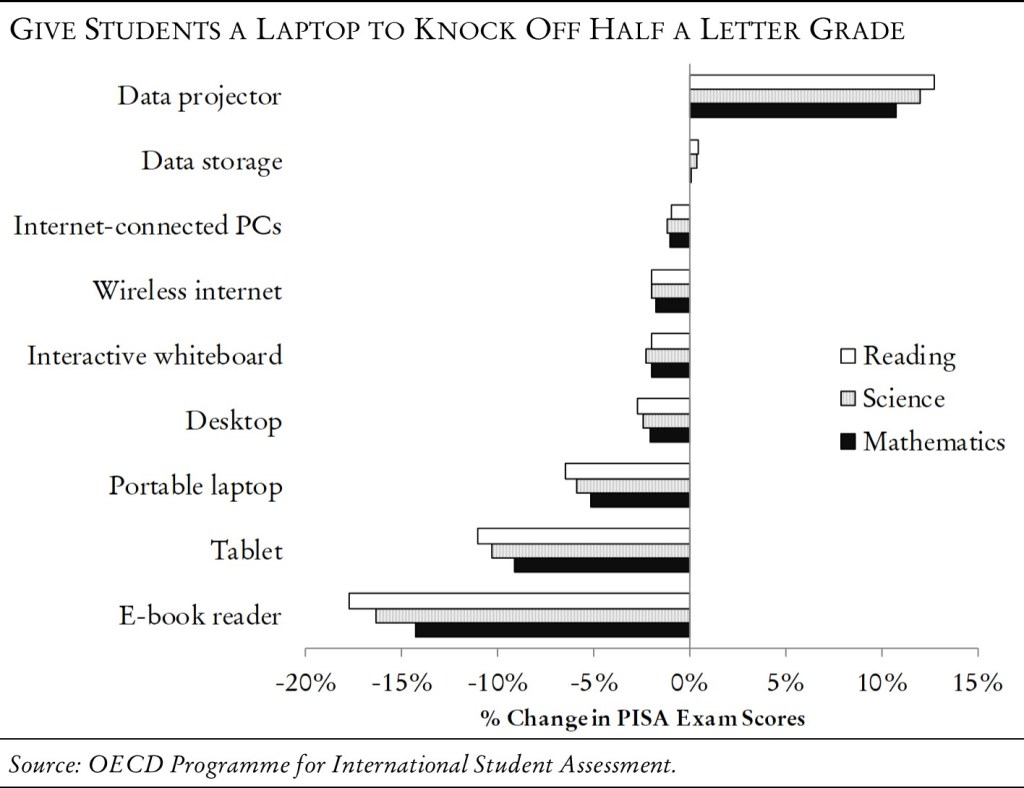 The largest international education survey, the OECD Programme for International Student Assessment (PISA), most recently tested over 540,000 students in seventy-two countries with exams on reading, science, and mathematics. The latest results showed that classroom usage of all of the most advanced equipment was associated with worse student performance on every type of exam.